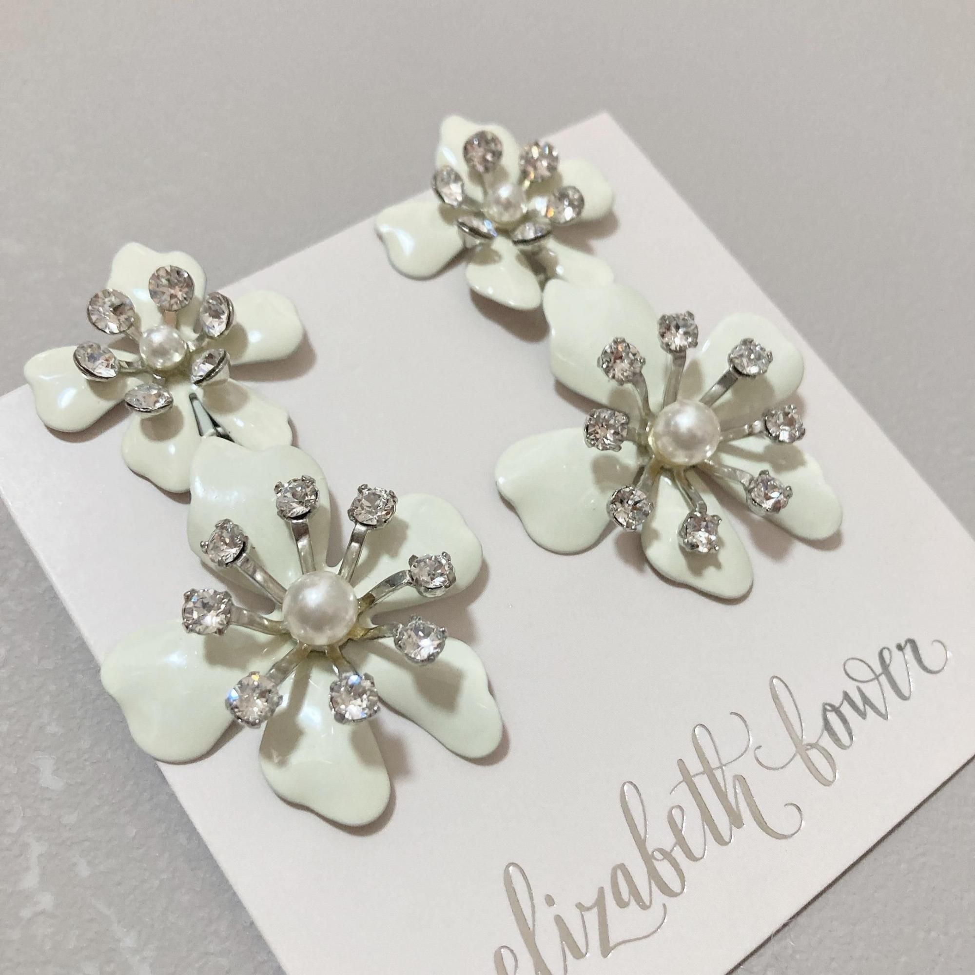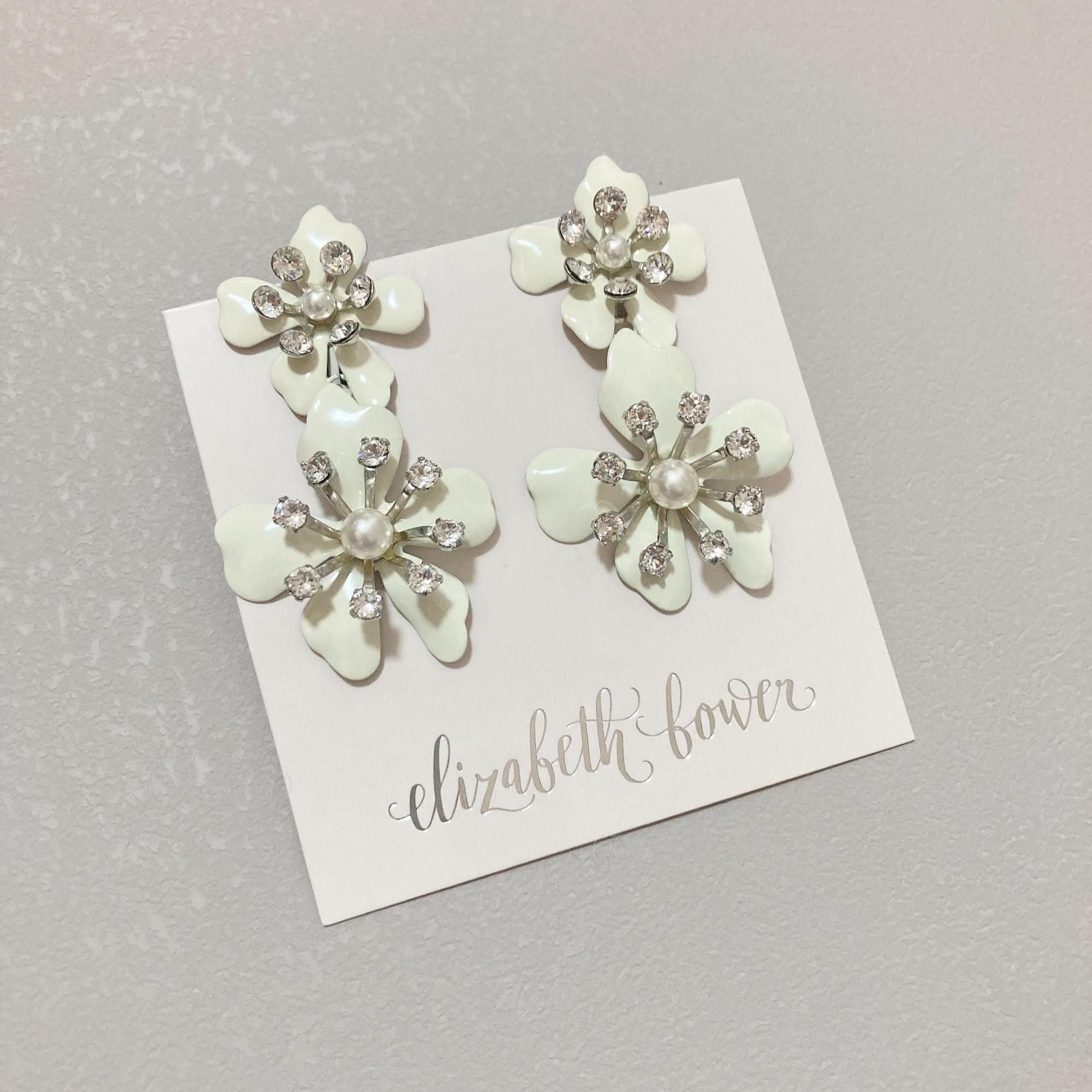 艶のあるミルキーホワイトのエナメルとクリスタルが可愛らしいドロップイヤリング、ナチュラルなスタイルやシンプルスタイルを彩ります。