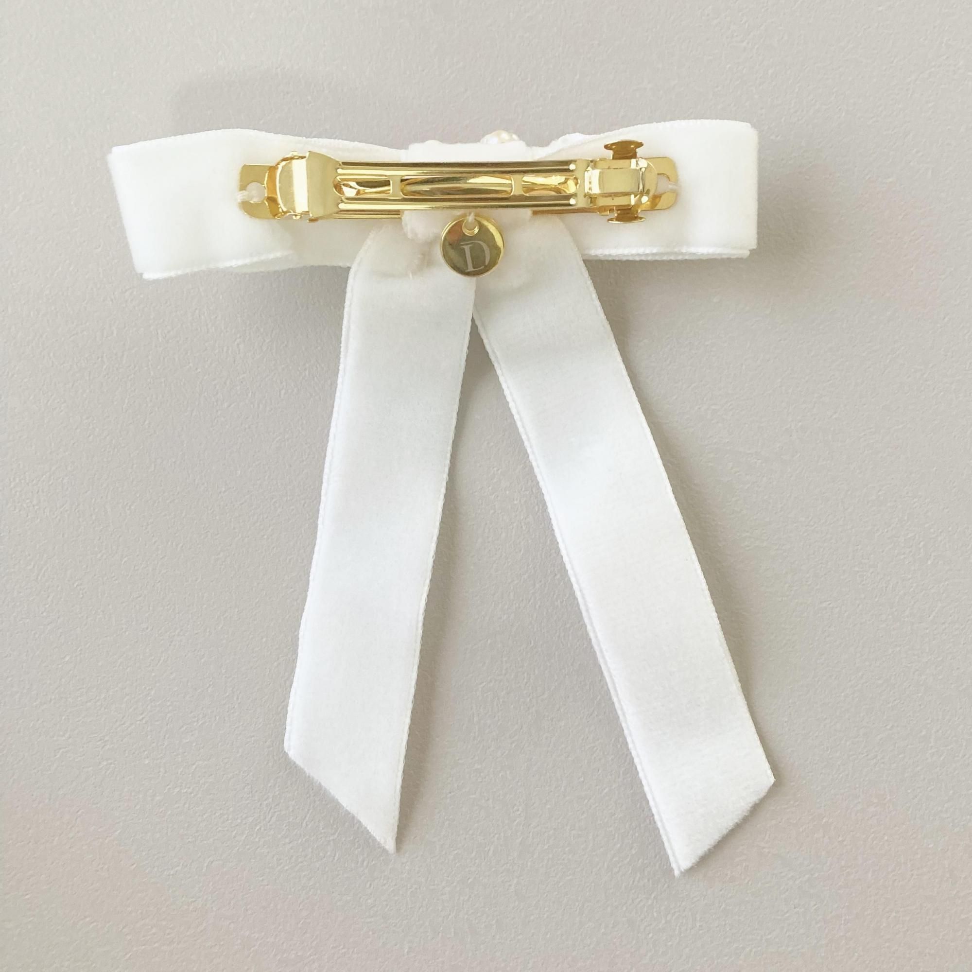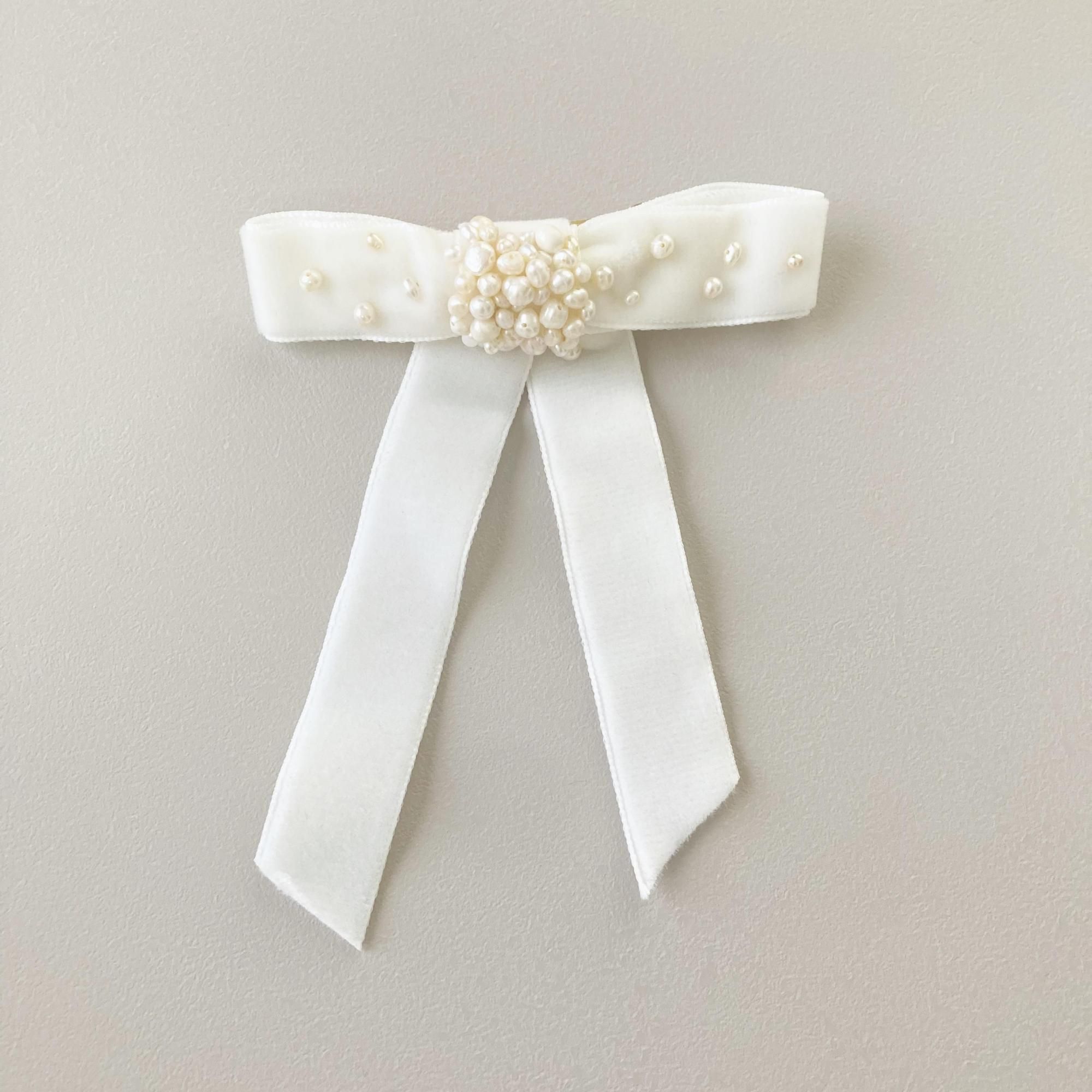 ベロアリボンに淡水パールがあしらわれたヘアアクセサリー。