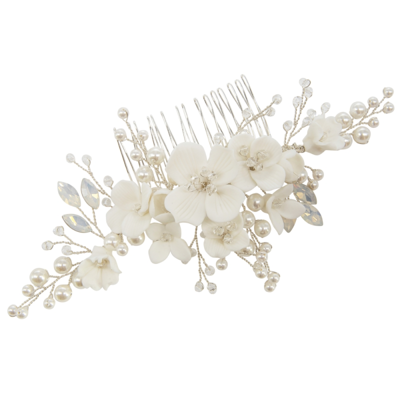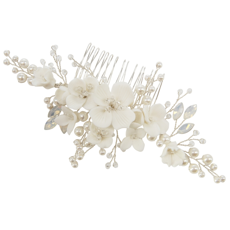 クレイフラワーを主役に、パールとクリスタルが彩りを添えるヘアアクセサリー。